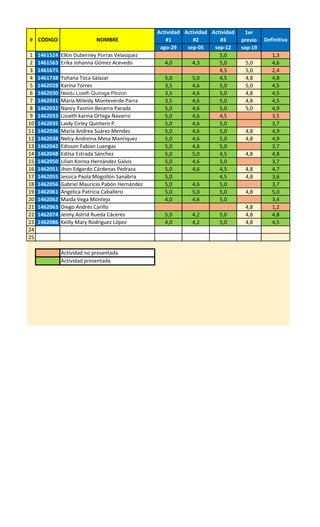 Le document présente les résultats d'activités académiques pour divers étudiants, comprenant des notes sur plusieurs dates. Les élèves sont identifiés par un numéro et leur performance est évaluée à travers différentes activités. Les données montrent une variété de notes, allant de 2,2 à 5,0, indiquant une performance moyenne variée.