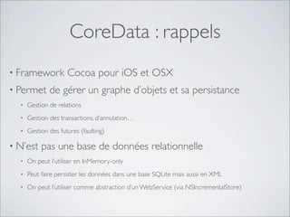 Le document présente MagicalRecord, un framework pour simplifier l'utilisation de Core Data dans les applications iOS, permettant une gestion plus claire et moins verbeuse du code. Il compare la complexité de Core Data avec les avantages d'utiliser MagicalRecord, montrant une réduction significative du nombre de lignes de code nécessaires pour des opérations similaires. Des exemples de code illustrent des fonctionnalités telles que la récupération et la création d'objets, la gestion de contextes, et l'initialisation de la pile Core Data.