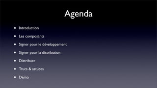 Le document présente un aperçu des étapes nécessaires à la signature et à la distribution d'applications iOS, en mettant l'accent sur les certificats, le provisioning et les méthodes de distribution. Il explique les différences entre le développement et la distribution, notamment les types de certificats et les configurations de projet requises. Des conseils pratiques et une démonstration sont également offerts pour faciliter le processus.