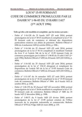 Le document présente la version consolidée du code de commerce marocain en vigueur depuis le 6 octobre 2016, incluant la loi n° 15-95 et ses modifications successives. Il décrit les dispositions relatives aux commerçants, aux actes de commerce, ainsi qu'aux obligations comptables et à l'organisation du registre du commerce. Cette loi vise à réglementer les activités commerciales et à assurer la transparence et la responsabilité des acteurs du commerce au Maroc.