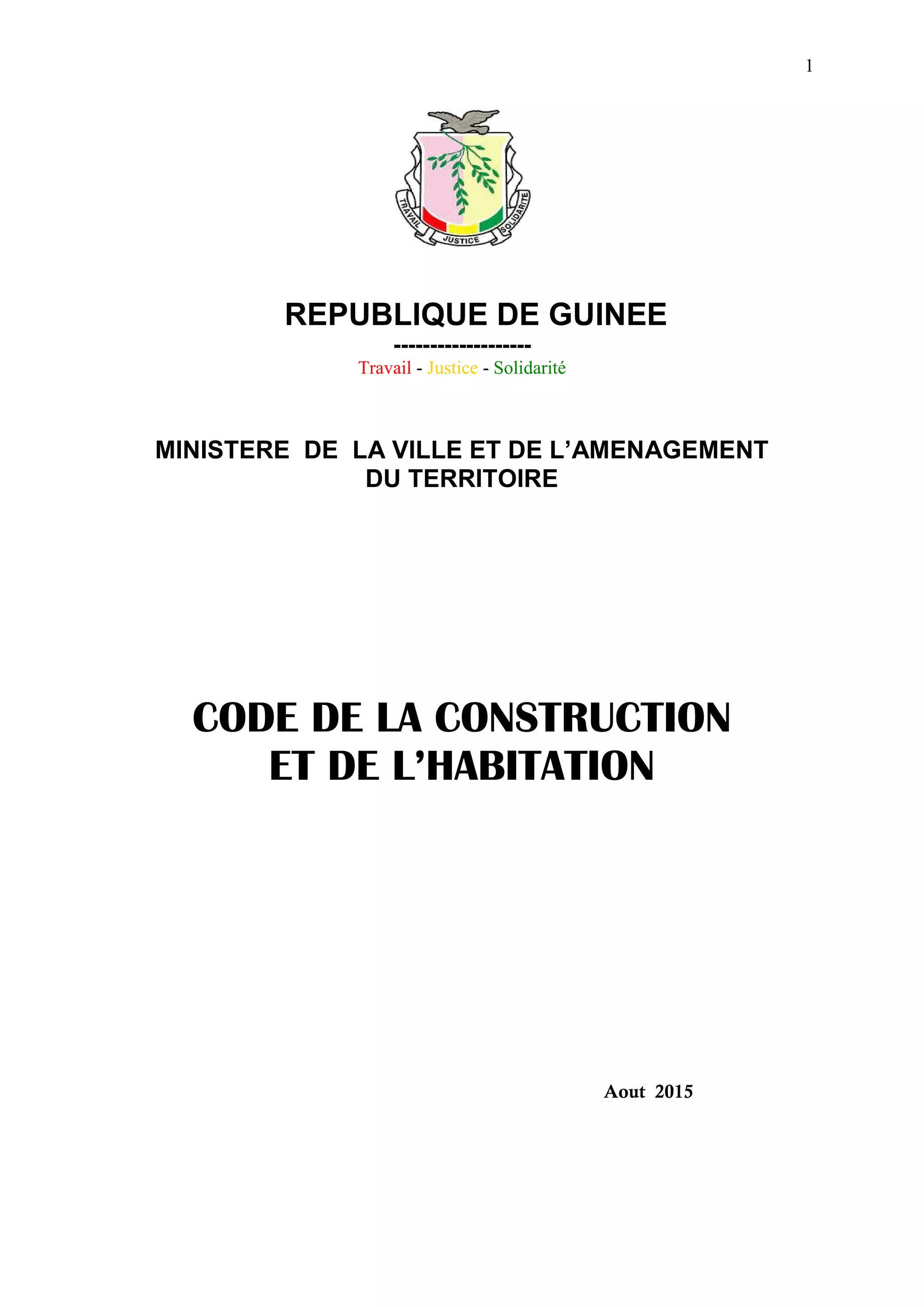 Le document présente le Code de la Construction et de l'Habitation de la République de Guinée, qui régit l'organisation, la réglementation et la promotion des activités de construction et d'habitation sur le territoire national. Il décrit les dispositions générales, les règles fondamentales relatives à la construction, ainsi que les responsabilités des acteurs impliqués dans ces processus, tels que les promoteurs immobiliers et les maîtres d'ouvrage. Ce code établit également les structures administratives et consultatives chargées de l'application des lois dans le domaine de la construction et de l'habitat.