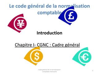 Le document présente le Code Général de Normalisation Comptable (CGNC) au Maroc, mis en place pour fournir un cadre comptable conforme aux standards internationaux et améliorer la fiabilité de l'information financière. Il aborde l'historique, la structure, ainsi que les principes fondamentaux du CGNC, soulignant les différences entre les systèmes comptables anglo-saxonnés et marocains. Le CGNC vise à répondre aux besoins des entreprises et aux exigences d'information macroéconomique, tout en promouvant la transparence et la bonne gouvernance comptable.
