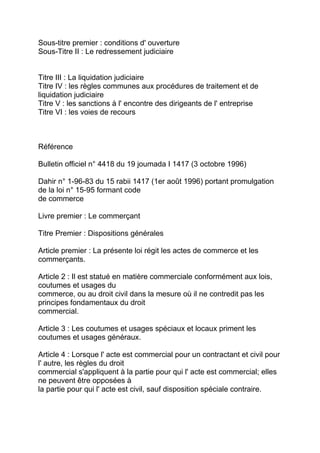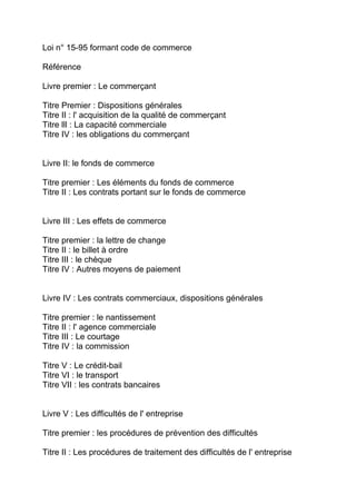 La loi n° 15-95 établit le code de commerce marocain, régissant des aspects clés tels que la qualité de commerçant, les obligations commerciales et les procédures de difficultés d'entreprise. Elle précise les actes considérés comme commerciaux, les exigences d'immatriculation au registre du commerce et les obligations comptables pour les commerçants. Le code vise à encadrer les relations commerciales et à assurer la transparence et la régulation du secteur commercial au Maroc.