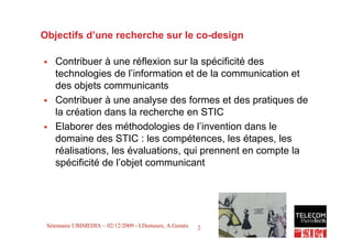 Le séminaire sur le co-design s'intéresse à l'interaction entre ingénierie et sciences humaines, en mettant en lumière l'importance des technologies de l'information et de la communication (TIC) dans ce processus. Il examine une recherche exploratoire sur les réseaux mobiles ad hoc, soulignant la nécessité d'une approche méthodologique collaborative pour aborder les défis liés à la conception et à l'usage des objets communicants. L'objectif est d'intégrer les perspectives techniques et sociales pour favoriser une réflexion plus approfondie sur les pratiques de création dans le domaine des TIC.