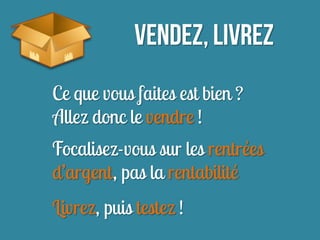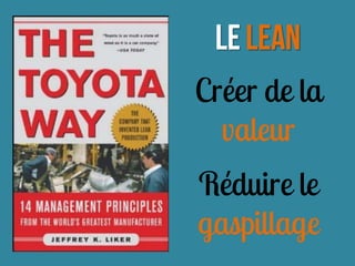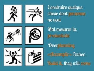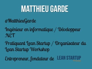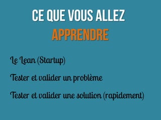 Le document aborde des concepts liés au Lean Startup, incluant des hypothèses sur le client et la solution ainsi que des processus de validation et d'adéquation produit/marché. Il mentionne également des questions de mise à l'échelle. Les sources citées incluent Dave McClure.