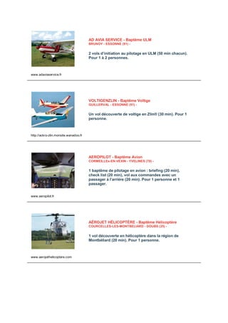 Le document présente diverses options de baptêmes de l'air en avion, hélicoptère, ULM et parapente à travers la France. Chaque offre inclut des détails sur la durée, le type de vol, le nombre de personnes et des liens vers les sites web des prestataires. Les expériences varient de l'initiation au pilotage à des vols panoramiques et personnalisés.