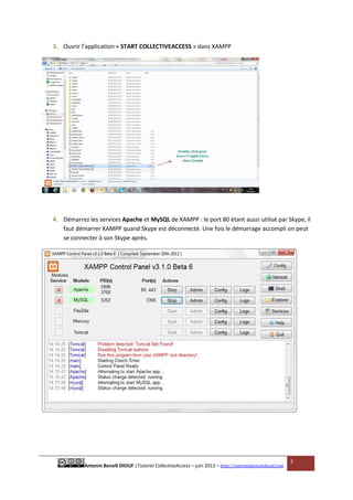 Ce document est un tutoriel sur l'outil de gestion des objets de musée et des archives, CollectiveAccess, incluant les étapes d'installation sur un serveur local Windows. Il décrit comment démarrer les services requis, accéder à l'interface et présenter les principales fonctionnalités telles que la création et la gestion de notices, le catalogage et la personnalisation des paramètres. Des instructions sur l'importation de données, l'indexation et le géoréférencement sont également fournies.