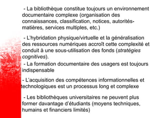 Le document traite d'une expérimentation visant à améliorer la continuité documentaire entre les lycées et les universités, mettant en lumière les défis de l'accès aux ressources numériques et la formation documentaire des usagers. Il souligne l'importance d'outils adaptés à la recherche d'informations, avec une proposition de liaison entre les acteurs éducatifs pour optimiser l'apprentissage des compétences informationnelles. Les résultats préliminaires montrent que l'expérimentation améliore la compréhension et l'utilisation des ressources documentaires chez les élèves.
