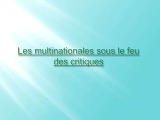 La responsabilité sociétale des entreprises (RSE) devient de plus en plus intégrée dans les activités des multinationales, mais la problématique de son authenticité demeure. Le document questionne si ces entreprises peuvent être à la fois socialement responsables et économiquement performantes, et propose deux hypothèses à évaluer par des exemples concrets. Les multinationales sont souvent perçues comme étant contraintes de prétendre à la RSE pour des raisons d'image et de compétitivité.