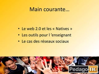 Le document explore l'intégration des outils du web 2.0 dans l'enseignement, en se concentrant sur les digital natives et leurs interactions avec la technologie. Il propose divers outils et applications pédagogiques, notamment des réseaux sociaux comme Twitter, pour améliorer l'apprentissage collaboratif et asynchrone. Les enseignants sont encouragés à maîtriser ces technologies pour les utiliser efficacement en classe.