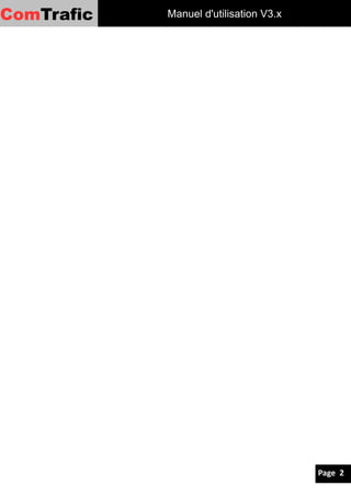 Le manuel d'utilisation de Comtrafic présente un logiciel de gestion des communications télécoms, visant à aider à la gestion financière et à l'analyse du trafic. Il détaille les fonctionnalités des différents menus, tels que la recherche d'appels, la facturation, et les options de paramétrage, ainsi que des principes d'utilisation pour optimiser l'usage du logiciel. Ce document inclut également des instructions pour configurer et personnaliser le logiciel en fonction des besoins spécifiques de l'utilisateur.