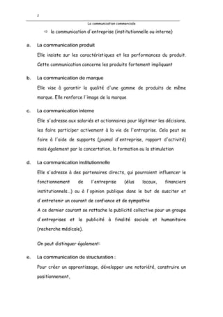 Le document traite de la communication commerciale, définissant ses objectifs, niveaux et outils, en mettant l'accent sur l'importance d'une communication intégrée et cohérente. Il explique les différents types de communication, tels que la communication produit, de marque, interne et institutionnelle, ainsi que les stratégies et canaux pour atteindre les consommateurs. Enfin, il aborde l'optimisation et l'évaluation des campagnes de communication, notamment par le biais de l'analyse des taux de retour et de rendement.