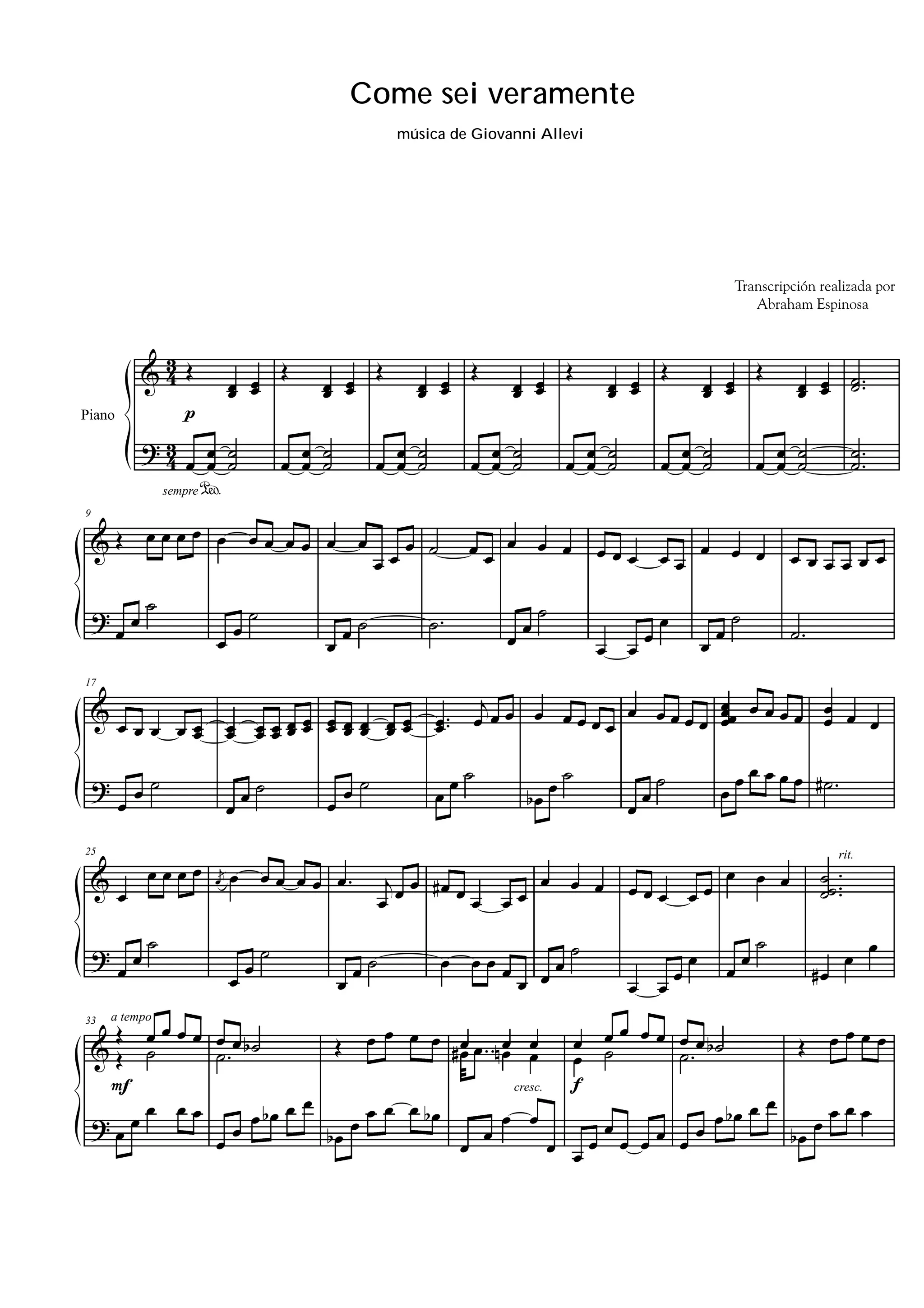 Le document est une transcription musicale de la pièce 'Come Sei Veramente' de Giovanni Allevi, réalisée par Abraham Espinosa. Il contient des notations et des indications de jeu pour piano, avec des modifications rythmiques et dynamiques. Ce document est destiné aux pianistes souhaitant interpréter cette œuvre.