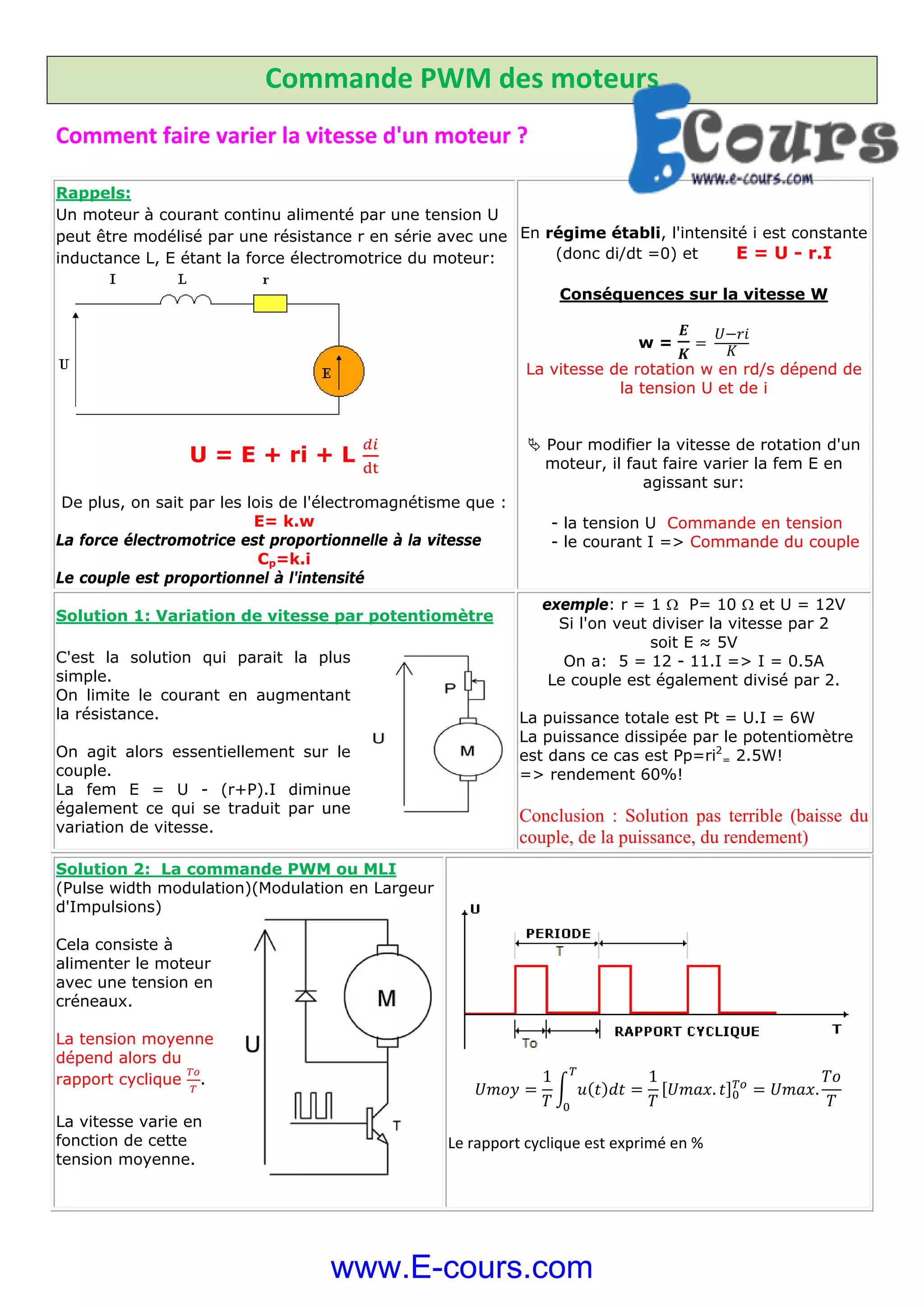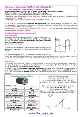 Le document présente comment faire varier la vitesse d'un moteur à courant continu par la modulation en largeur d'impulsions (PWM). Il explique les concepts fondamentaux tels que la force électromotrice, le couple, et les avantages de la PWM, notamment l'amélioration du rendement énergétique et le contrôle via des microcontrôleurs. Il aborde également les aspects techniques comme la fréquence de commande, les caractéristiques d'un moteur spécifique et des exemples de programmation avec des microcontrôleurs.