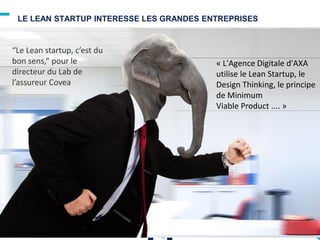 Le document aborde l'adoption du Lean Startup par des grandes entreprises qui, bien que conscientes des avantages, rencontrent des freins tels que l'inertie et la peur du changement. Il propose des solutions pour surmonter ces obstacles, notamment en valorisant les bénéfices et en réorganisant le travail pour encourager l'innovation. Enfin, il souligne l'importance de créer une culture d'entreprise user-centrique, participative et collaborative.
