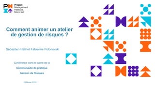 Le document présente un atelier de gestion de risques animé par Sébastien Halil et Fabienne Polonovski, visant à identifier, analyser et prioriser les risques d'un projet. Les conférenciers, experts en gestion de projet, abordent l'importance du contrôleur de projet (PCO) dans l'animation de tels ateliers et exposent un processus structuré pour engager les participants. L'atelier inclut des activités de brainstorming, d'évaluation des risques, et de formulation de plans d'action pour assurer le succès du projet.