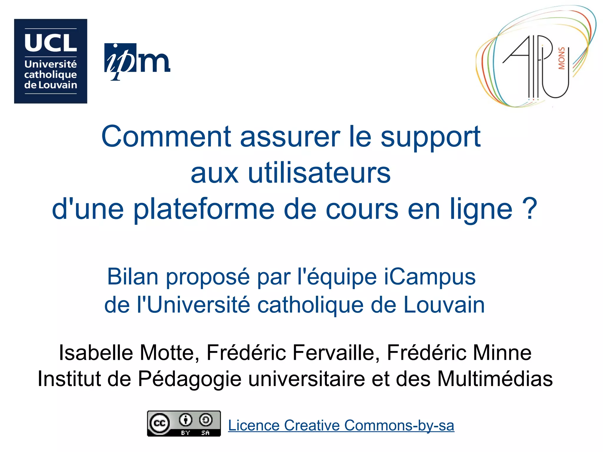 Le document analyse les modalités de support aux utilisateurs de la plateforme de cours en ligne iCampus à l'Université Catholique de Louvain, mettant en évidence la charge de travail liée au support technique par mail et les attentes croissantes des utilisateurs pour un accompagnement personnalisé. Il propose également des solutions comme un manuel en ligne populaire et l'utilisation de screencasts pour améliorer la formation et l'information des utilisateurs. En conclusion, le rapport recommande de continuer à optimiser les processus de support et d'améliorer la documentation pour mieux répondre aux besoins des étudiants et enseignants.