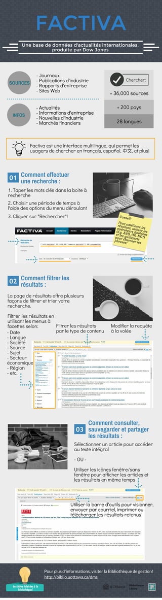 Factiva est une base de données d'actualités internationales qui regroupe plus de 36 000 sources dans 200 pays et 28 langues. Les utilisateurs peuvent effectuer des recherches multilingues à l'aide de mots clés et de filtres spécifiques pour affiner leurs résultats. La plateforme propose également des outils pour visualiser, partager et sauvegarder les informations trouvées.