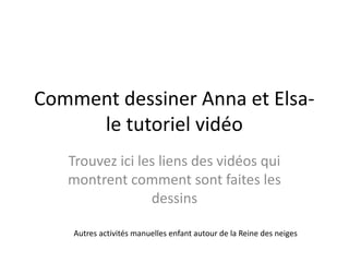 Le document propose un tutoriel vidéo détaillé sur comment dessiner et colorier les personnages Anna et Elsa de 'La Reine des Neiges'. Il fournit également des liens vers des vidéos éducatives ainsi que des suggestions d'autres activités manuelles pour les enfants. Ce contenu est centré autour de l'univers de 'La Reine des Neiges'.