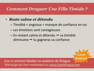 Le document fournit 19 conseils pour séduire une fille timide, mettant l'accent sur l'importance de rester calme et détendu pour réduire son anxiété. Il conseille également de s'informer sur sa situation sociale et personnelle, d'adapter sa stratégie, et d'intégrer son cercle d'amis pour gagner sa confiance. Enfin, la prise d'initiative et une approche directe et sincère sont essentielles pour montrer son intérêt sans insistance.