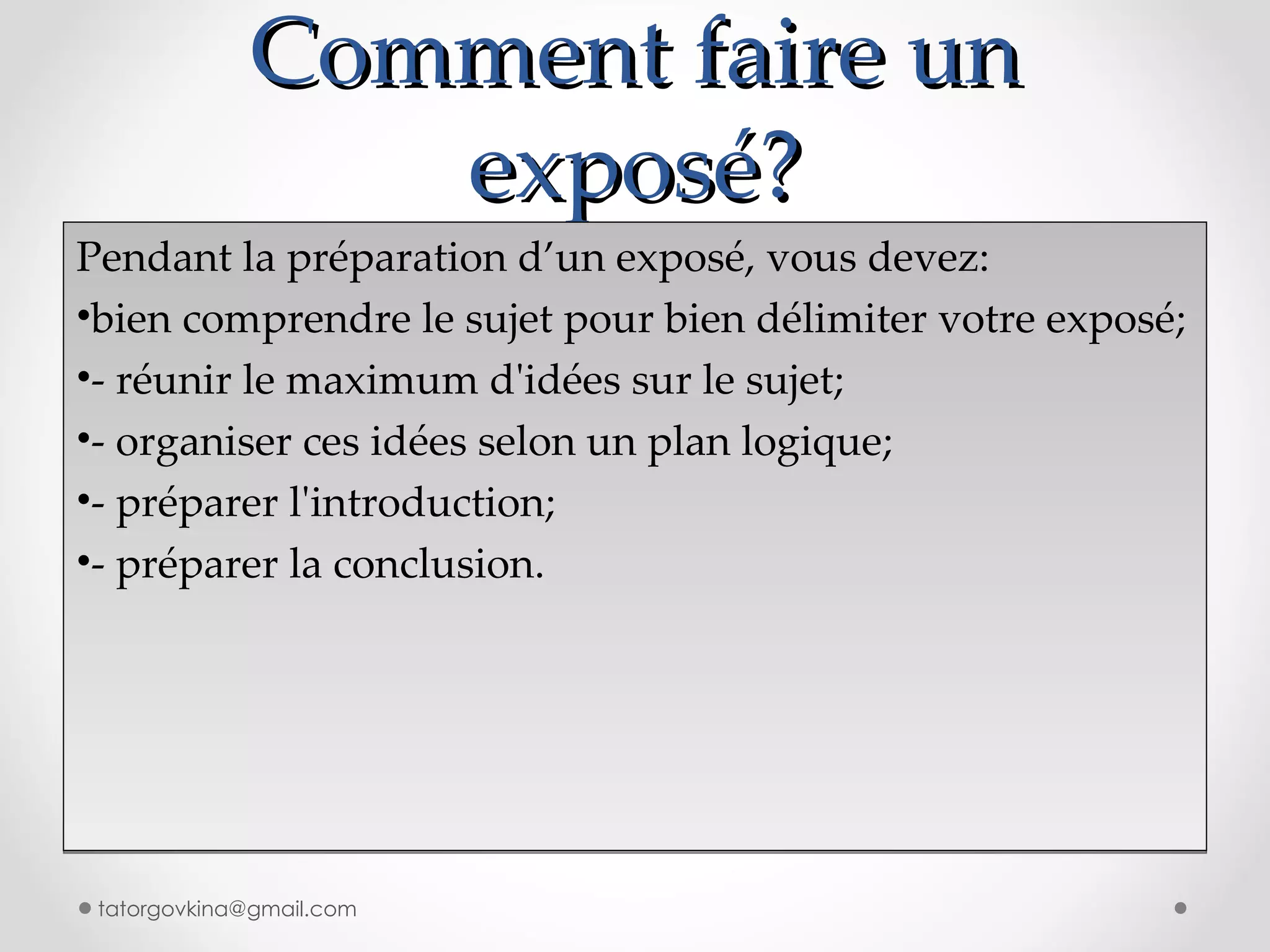 Le document fournit des conseils sur la préparation et la structuration d'un exposé, y compris l'importance de bien comprendre le sujet, de rassembler des idées et de les organiser selon un plan logique. Il décrit différents types de plans, tels que le chronologique, le comparatif et le dialectique, et donne des exemples pour chaque type. La conclusion souligne l'importance de bien terminer l'exposé et d'inviter à la discussion.