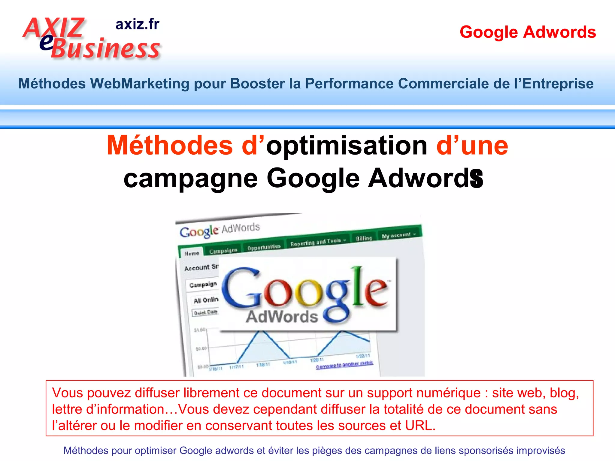 Le document présente des méthodes pour optimiser les campagnes Google AdWords afin de maximiser la performance commerciale des entreprises. Il aborde des étapes méthodiques pour construire une stratégie web efficace, évitant les pièges fréquents des campagnes de liens sponsorisés. Des conseils pratiques sur la création d'annonces, le choix des mots-clés et l'amélioration du quality score sont également fournis.