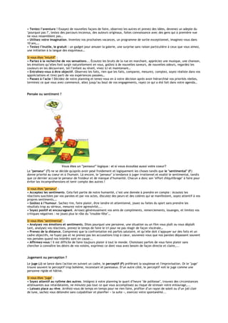 Le document présente des conseils pratiques pour équilibrer sa personnalité en fonction des résultats des tests de type MBTI. Il propose des stratégies pour les différents types de personnalité (introvertis, extravertis, sensitifs, intuitifs, penseurs, sentimentaux, juges, perceptifs) afin d'améliorer les relations interpersonnelles et de mieux vivre. L'idée centrale est que chacun peut évoluer tout en préservant ses talents, en faisant des efforts pour comprendre et s'adapter aux autres.