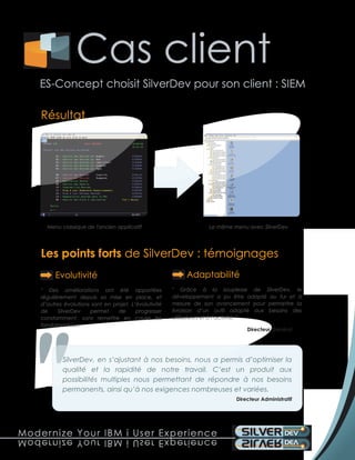 Le document présente un projet de mise en œuvre de Silverdev pour le client SIEM, visant à moderniser les interfaces existantes pour améliorer l'expérience utilisateur. Le développement a été efficient, effectué en 70 jours par une seule personne, et a été validé par un comité d'utilisateurs tout au long du processus. Les résultats montrent une meilleure adaptation aux besoins des utilisateurs et une évolutivité continue de l'application.