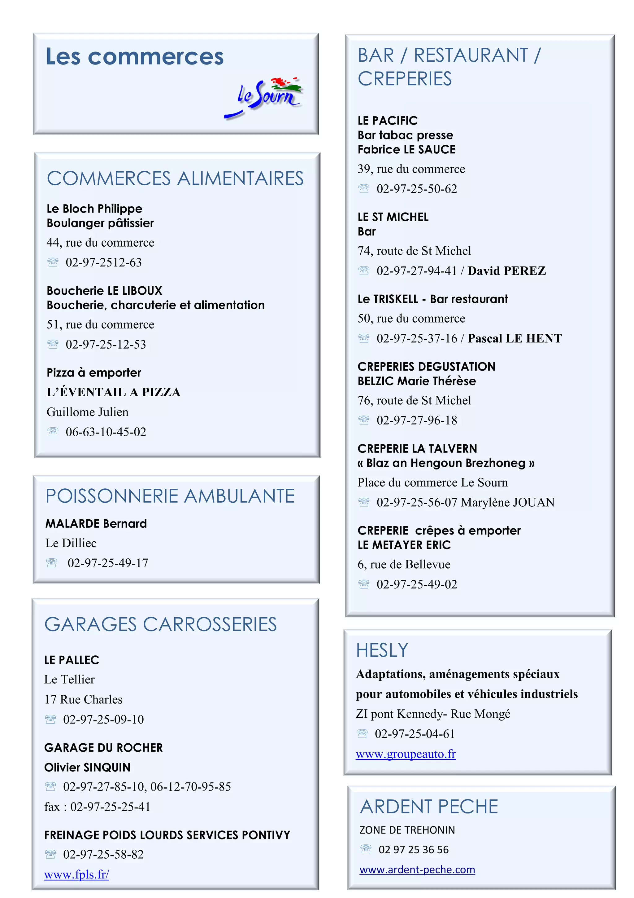 Le document liste divers commerces, notamment des bars, restaurants, crêperies et garages situés à Pontivy, avec leurs adresses et numéros de téléphone. Il inclut également des commerces alimentaires comme des boulangeries, boucheries et pizzerias. Des informations sur des services d'adaptation de véhicules sont également fournies.