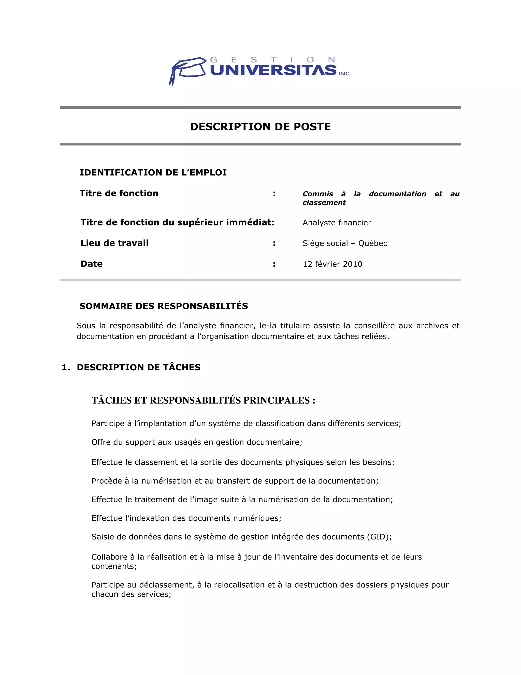 Le document est une description de poste pour le rôle de commis à la documentation et au classement, sous la supervision d'un analyste financier. Les principales responsabilités incluent l'organisation documentaire, l'indexation et la numérisation de documents, ainsi que le soutien aux utilisateurs en gestion documentaire. Les exigences incluent une formation professionnelle, 3 à 5 ans d'expérience en gestion documentaire et de bonnes compétences informatiques.