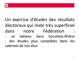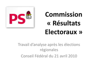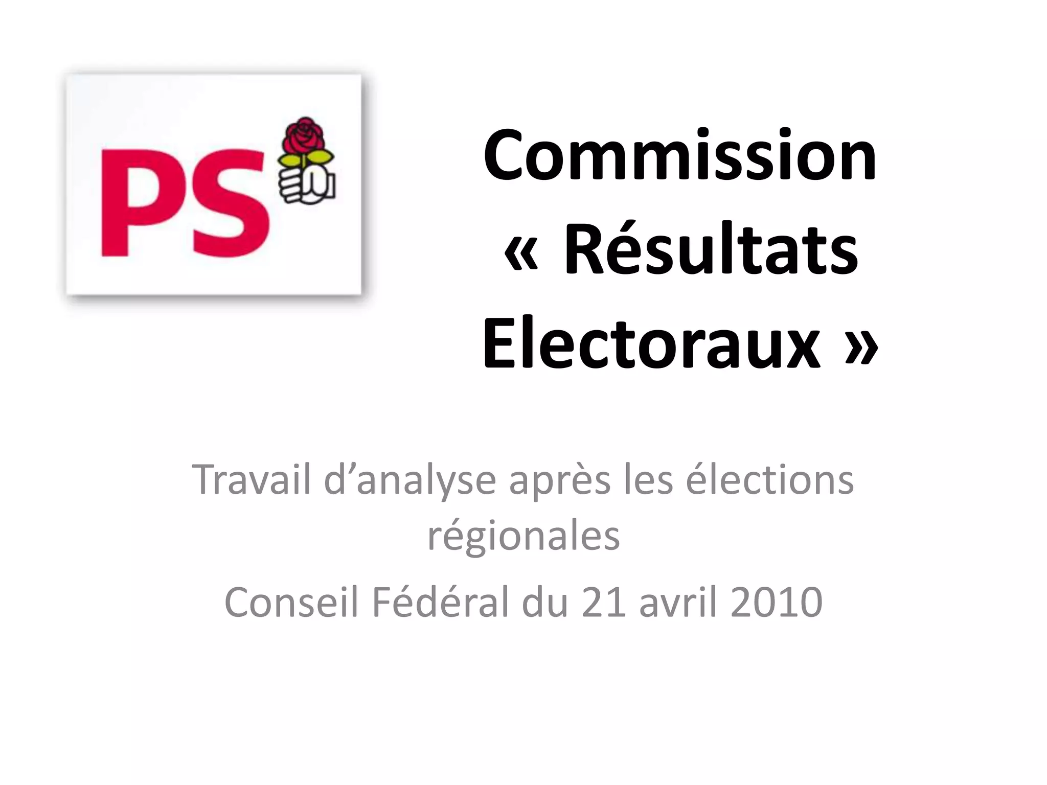 Le document présente une analyse des résultats électoraux des élections régionales de 2010, soulignant une forte abstention et des changements dans les tendances de vote. Il met l'accent sur la nécessité d'approfondir l'étude des élections et d'adapter les stratégies politiques face à l'évolution des préoccupations des électeurs, telles que le chômage et le pouvoir d'achat. La commission 'résultats électoraux' souhaite établir une étude systématique pour chaque scrutin afin de mieux comprendre les dynamiques électorales.