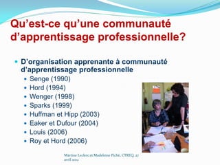 Le document présente la mise en place d'une communauté d'apprentissage professionnelle visant à améliorer les pratiques d'enseignement, soulignant l'importance de la collaboration entre les enseignants pour l'amélioration des résultats scolaires des élèves. Il décrit les différences entre les écoles traditionnelles et les communautés d'apprentissage professionnelles, ainsi que les éléments clés pour favoriser un environnement d'apprentissage collaboratif. Enfin, le texte met en évidence les impacts positifs observés sur les élèves, les enseignants et la direction d'école, ainsi que les exigences nécessaires pour implanter ce type de communauté.