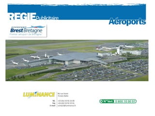 L'aéroport de Brest Bretagne est le premier aéroport de Bretagne et le 15ème en France, avec près de 920 000 passagers par an, majoritairement des voyageurs d'affaires. Les supports publicitaires disponibles incluent des panneaux, des podiums pour des opérations marketing, et divers formats de toiles. La majorité des passagers sont issus du département, avec un temps moyen passé sur le site de 30 minutes.