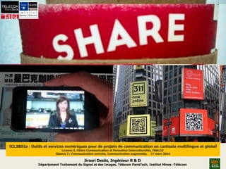 Le document traite des outils et services numériques pour la communication en contexte multilingue, en se concentrant sur des techniques telles que la communication enrichie et augmentée. Il présente des exemples pratiques comme l'utilisation de QR codes et de la plateforme Aurasma pour créer des expériences interactives. Des ressources et des tutoriels liés à ces technologies sont également fournis pour faciliter leur application dans divers domaines.