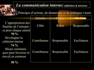 Le document traite de la communication interne et inter-personnelle au sein des entreprises, définissant des missions et des étapes pour un plan de communication efficace. Il présente des diagnostics, des objectifs, des méthodologies ainsi que des conseils pour améliorer les relations et éviter les malentendus. Le processus de communication est décomposé en quatre étapes essentielles, en insistant sur l'importance de la méta-communication et d'un style de communication adulte.
