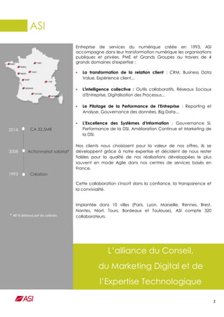 ASI, entreprise de services numériques fondée en 1993, accompagne la transformation digitale de divers secteurs grâce à son expertise en relation client, intelligence collective, performance et systèmes d'information. L'entreprise valorise des principes humanistes tels que la transparence et la diversité, tout en s'engageant activement dans la responsabilité sociétale et environnementale, notamment à travers son adhésion au Pacte mondial des Nations Unies. Avec 320 collaborateurs répartis sur 10 sites, ASI met en avant le bien-être au travail, l'inclusion et les initiatives écologiques pour réduire son empreinte carbone.