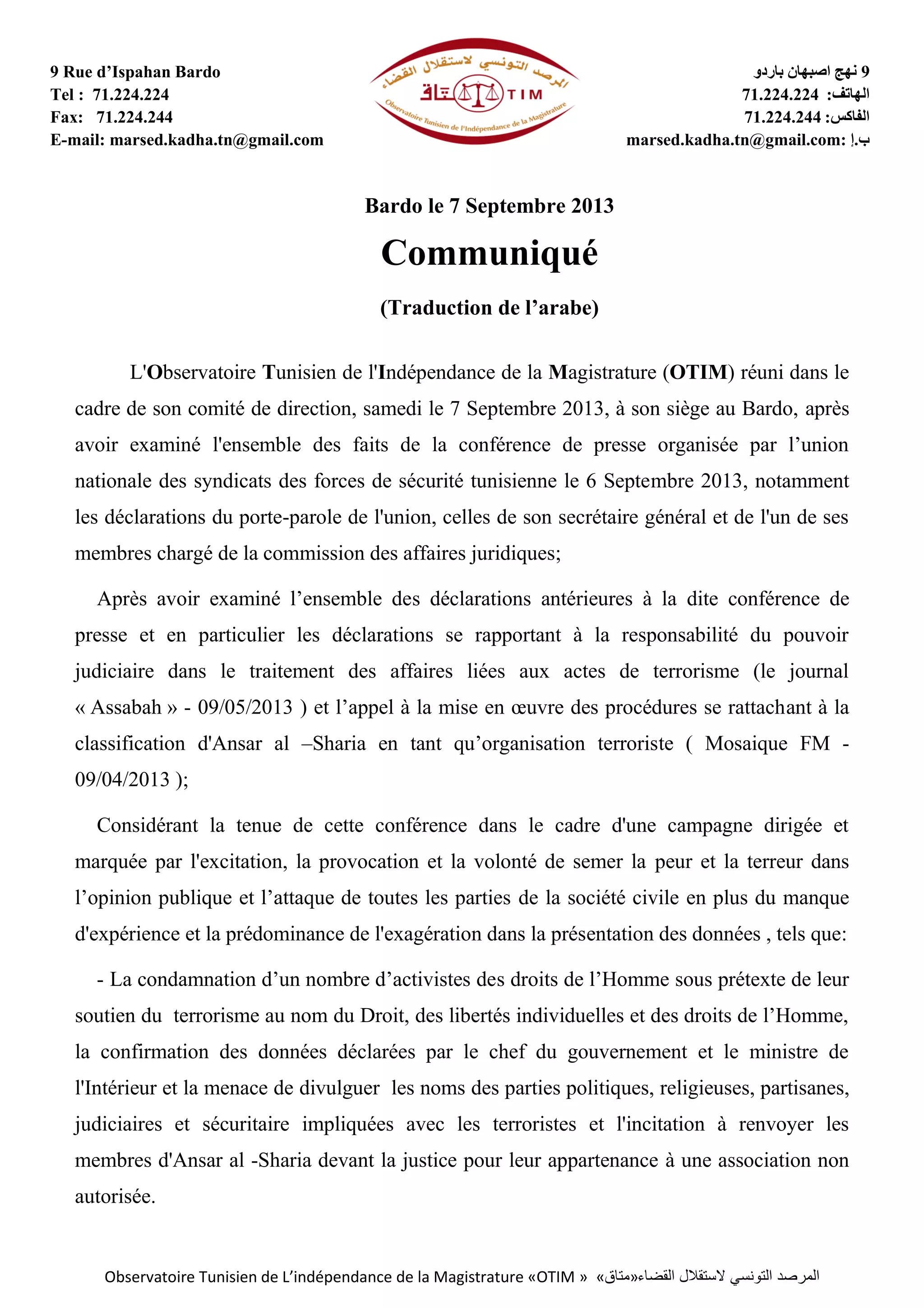 L'Observatoire tunisien de l'indépendance de la magistrature (OTIM) dénonce les accusations portées contre des juges et des activistes des droits de l'homme lors d'une conférence de presse par des représentants des syndicats de sécurité, affirmant que cela remet en question l'intégrité du pouvoir judiciaire. L'OTIM met en garde contre les atteintes aux droits humains au nom de la lutte contre le terrorisme et appelle à la protection de l'indépendance de la justice. Il souligne la nécessité d'une clarification de la part des ministères concernés pour éviter de tels abus.