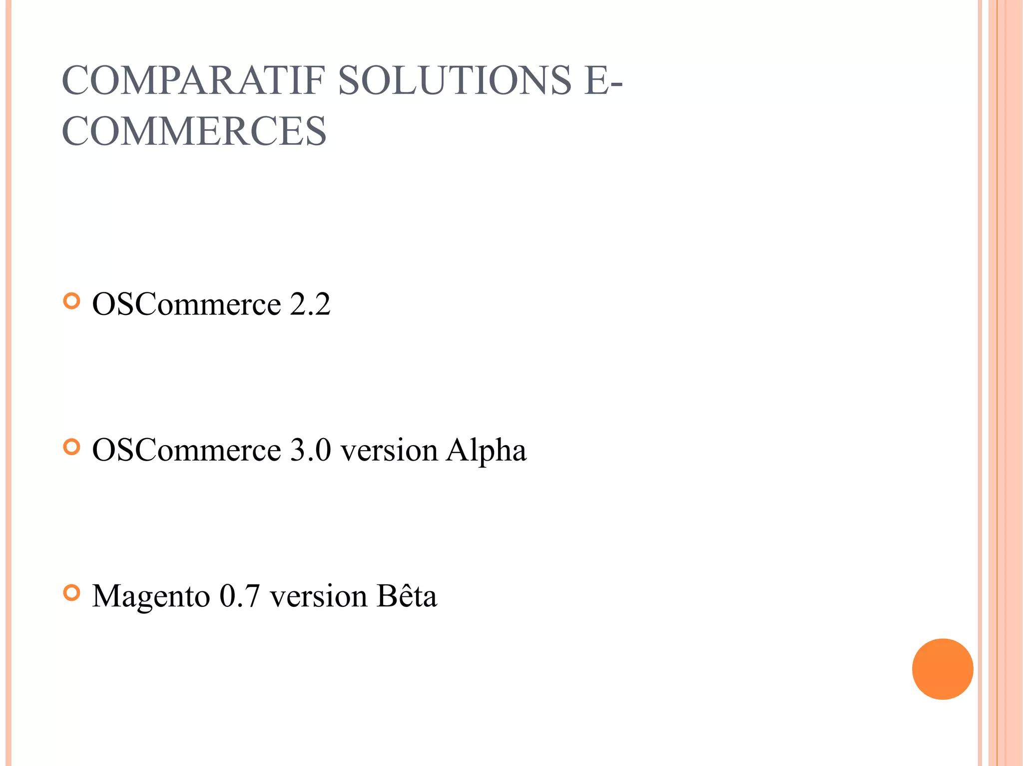 Ce document compare différentes solutions e-commerce, notamment Magento et osCommerce dans ses deux versions. Il détaille les configurations logicielles requises, les moteurs de programmation, les systèmes de templates, la gestion des plugins et des langues, ainsi que les fonctionnalités de base de chaque plateforme. Magento se distingue par ses fonctionnalités avancées et sa capacité de personnalisation, tandis qu'osCommerce présente des limites en termes de gestion et d'évolutivité.