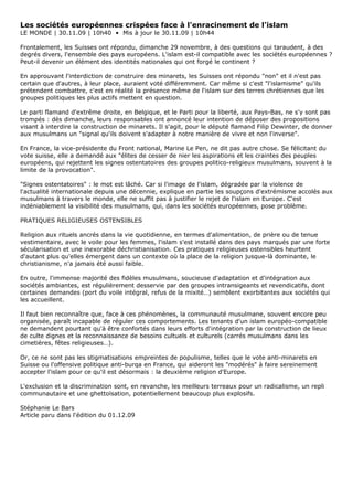L'interdiction suisse de construire des minarets est révélatrice des tensions en Europe sur l'islam, où des partis politiques extrémistes exploitent les craintes liées à la visibilité musulmane. Cette situation est aggravée par le manque d'organisation de la communauté musulmane pour promouvoir une intégration positive. Les mesures de stigmatisation telles que cette interdiction peuvent favoriser le radicalisme et le repli communautaire.