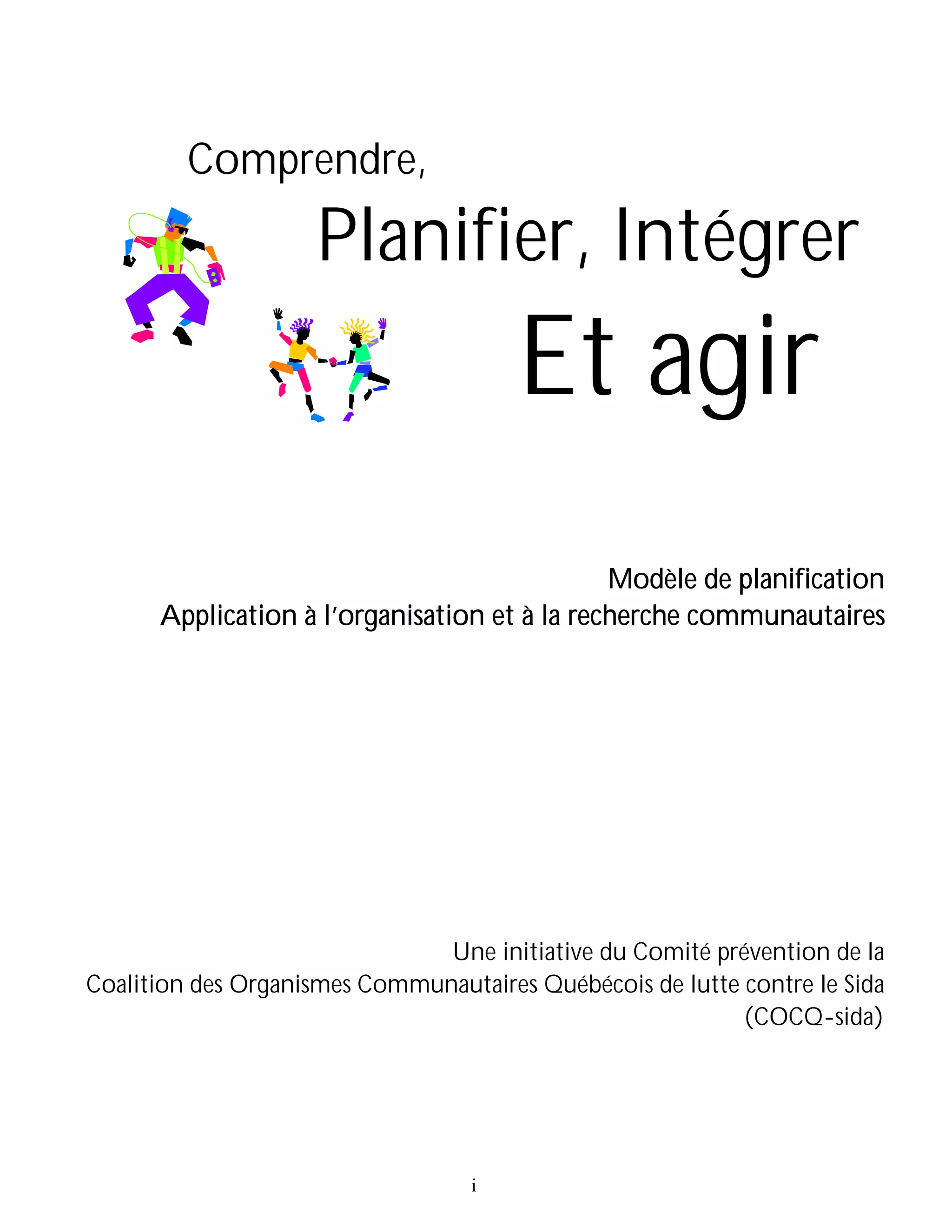 Le document présente un modèle de planification, intitulé « comprendre, planifier, intégrer et agir », destiné à l'organisation et à la recherche communautaires, inspiré du modèle PRECEDE/PROCEED. Ce modèle vise à améliorer la qualité de vie et la santé des groupes ciblés en intégrant les résultats de la recherche communautaire dans les actions. Il aborde différentes étapes de diagnostics sociaux, épidémiologiques et comportementaux, tout en soulignant l'importance d'adapter les interventions aux besoins spécifiques des communautés.