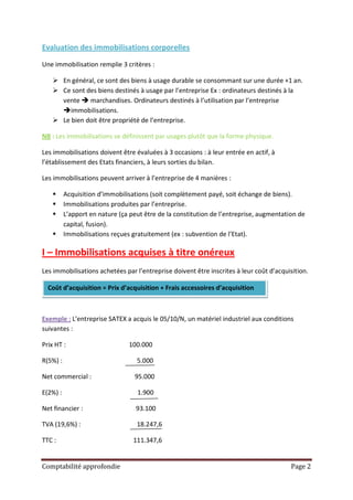 Le document aborde les principes fondamentaux de la comptabilité, notamment l'évaluation et l'enregistrement des immobilisations corporelles et incorporelles. Il détaille les critères de classification des immobilisations, leur coût d'acquisition, ainsi que des exemples pratiques de comptabilisation. Enfin, il souligne les différences fiscales liées aux immobilisations et la gestion des charges financières associées.