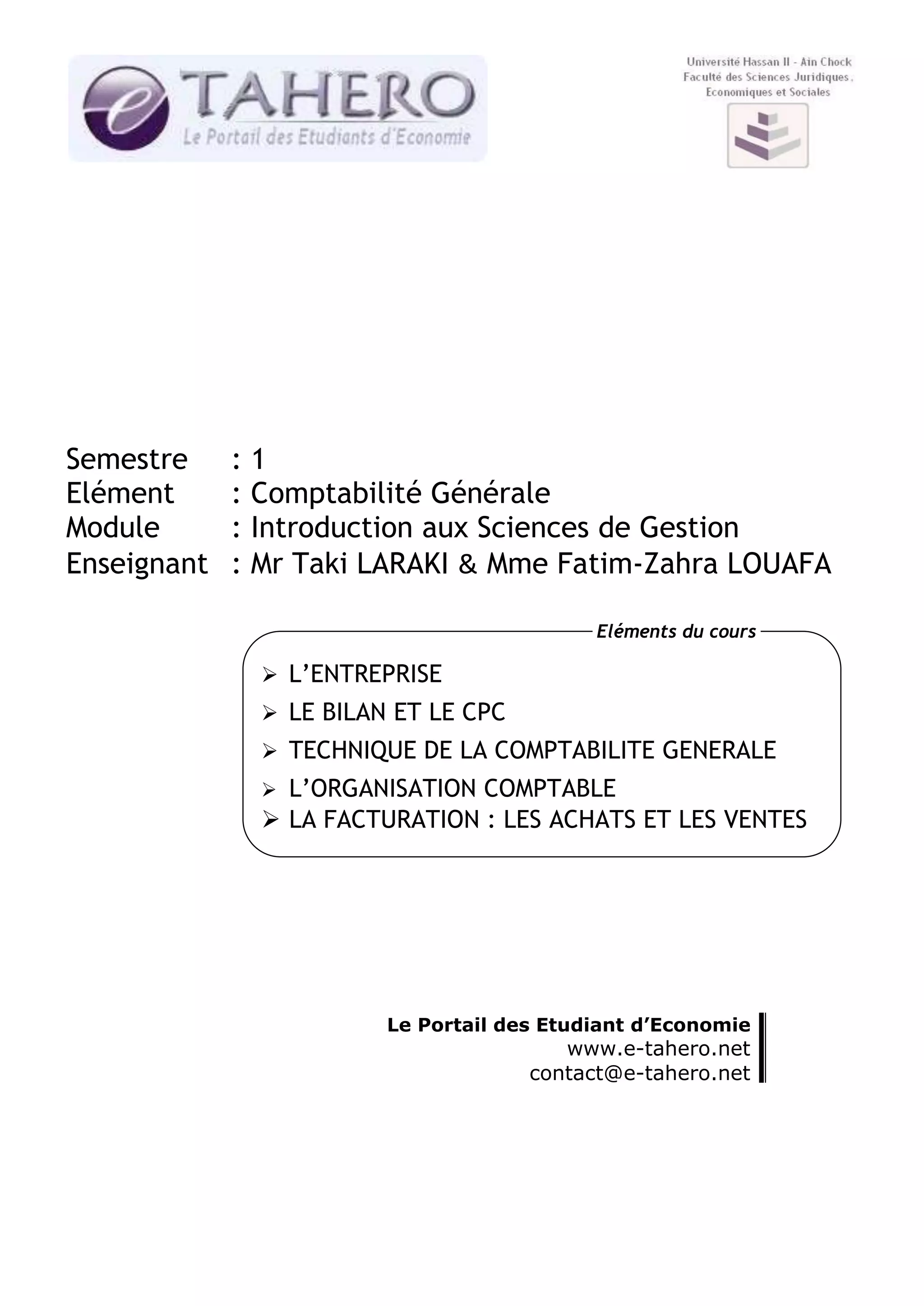 Ce document présente un cours de comptabilité générale, abordant les notions clés telles que l'entreprise, le bilan et le compte de produits et charges. Il définit l'entreprise comme une unité économique et explique la structure et l'importance du bilan dans la synthèse des données financières. Le document inclut également des exercices pratiques pour établir des états financiers.
