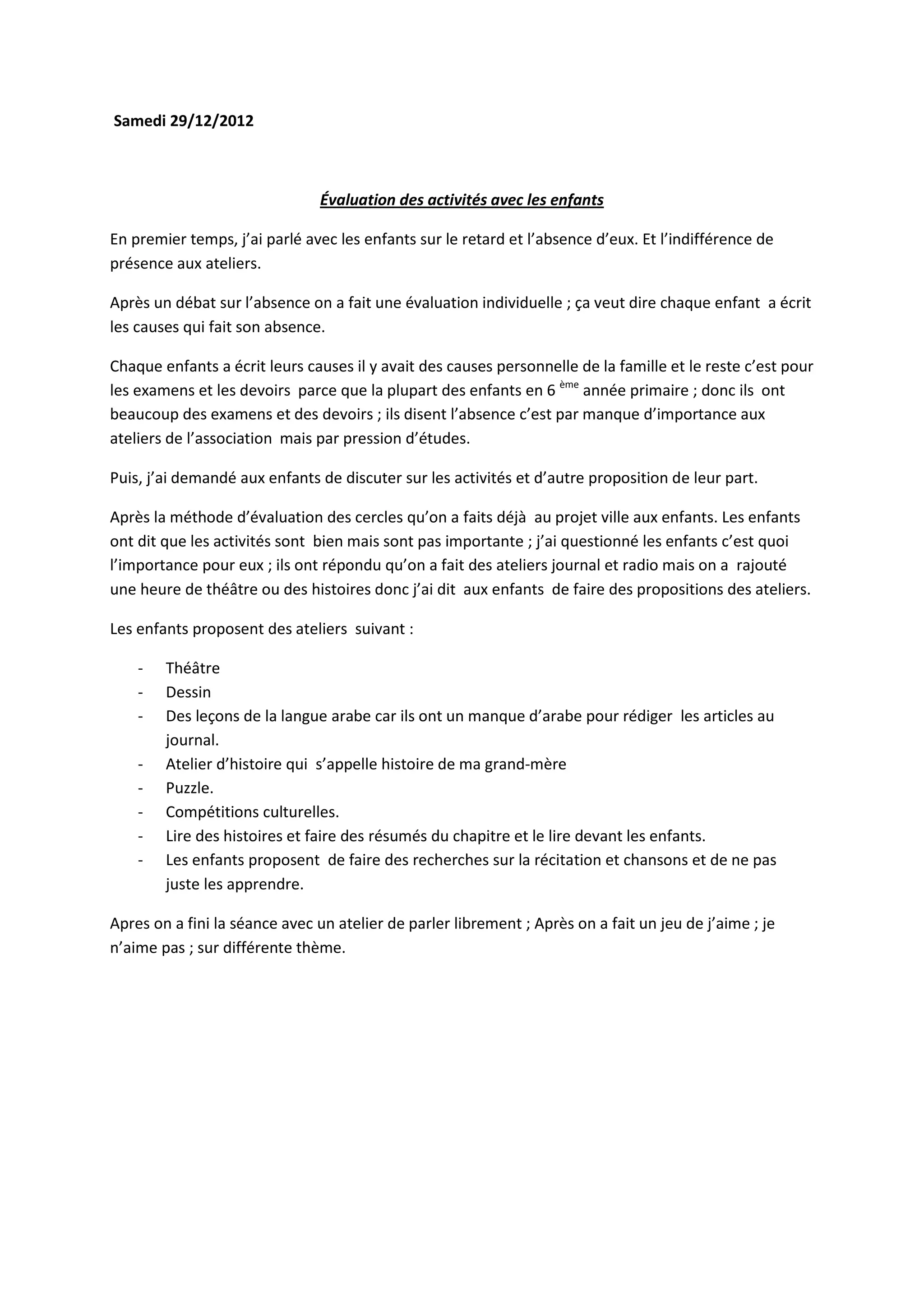 Le document relate une évaluation des activités pour enfants, où les participants ont discuté de leurs absences et de leurs préférences d'ateliers. Les enfants ont identifié l'importance de l'école et proposé des activités comme le théâtre, le dessin et des leçons d'arabe pour mieux rédiger. La séance s'est terminée par des discussions libres et un jeu interactif.
