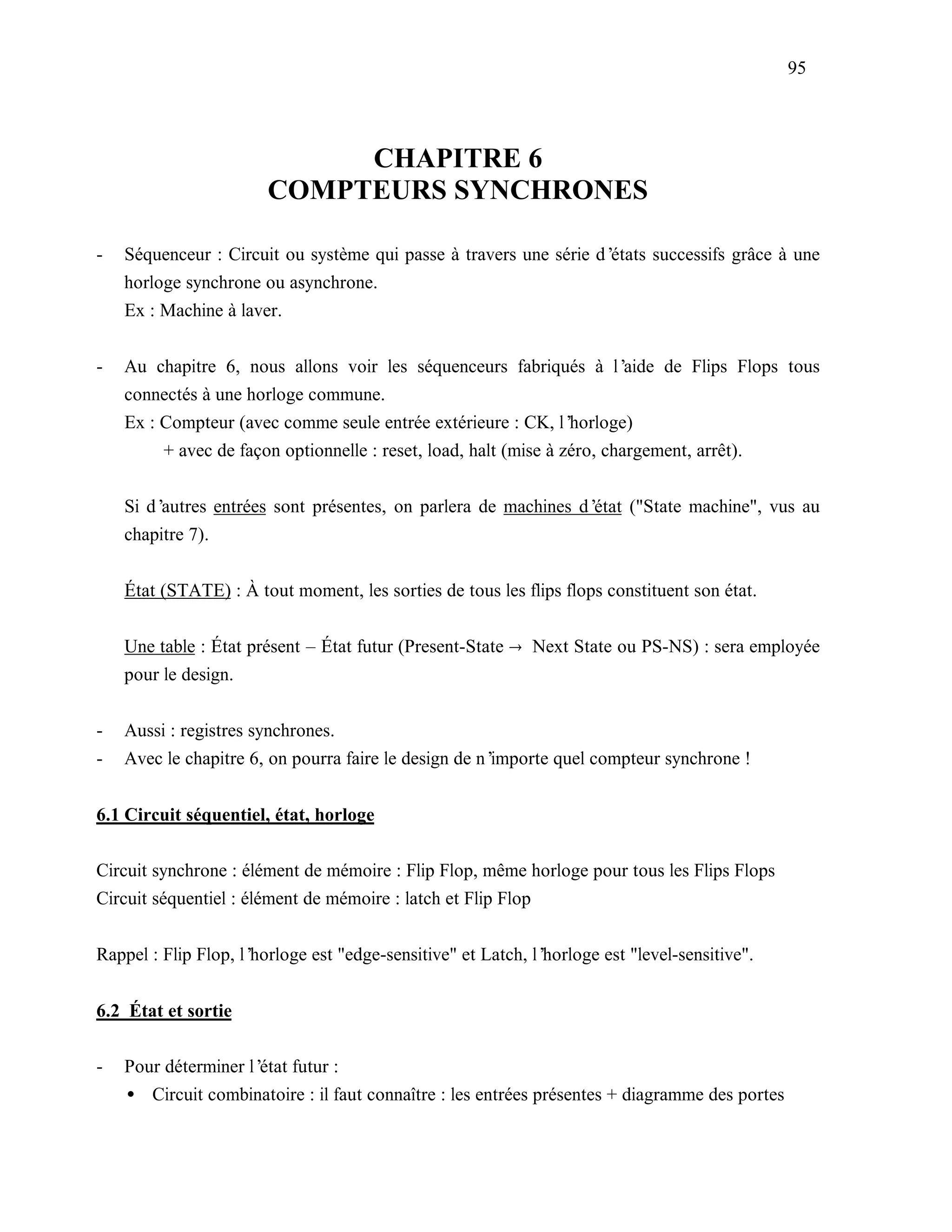 Le chapitre 6 aborde la conception de compteurs synchrones et séquenceurs utilisant des flips flops synchronisés à une horloge, expliquant les concepts de circuits séquentiels et combinatoires ainsi que les méthodes de design associées. Plusieurs types de compteurs, tels que les compteurs à décade et les registres à décalage, sont présentés, en expliquant la manière de minimiser et d'optimiser les états. Les étapes d'analyse et de design, ainsi que des considérations pratiques sur la fréquence d'horloge et les états des circuits, sont détaillées pour guider la réalisation de circuits efficaces.