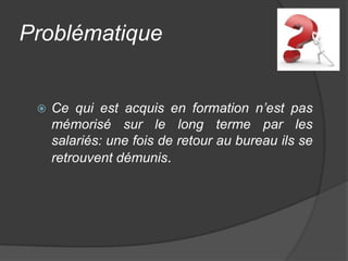 Le document aborde la problématique de la rétention des compétences acquises lors des formations par les salariés. La solution proposée, 'computraining replay', permet aux participants de revoir gratuitement pendant 3 mois les vidéos de formation. Il met également en avant l'avantage concurrentiel des cartes de visite équipées d'un flashcode pour accéder rapidement à divers contenus multimédias.