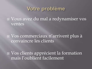 La solution présentée vise à revitaliser les ventes en améliorant la formation des clients grâce à des vidéos accessibles 24h/24 sur divers appareils. De nouvelles cartes de visite avec QR codes permettent aux commerciaux de démontrer efficacement le service à des clients potentiels, en prouvant son efficacité directement. Cette approche permet de se distinguer de la concurrence en offrant des démonstrations pratiques et accessibles à tout moment.