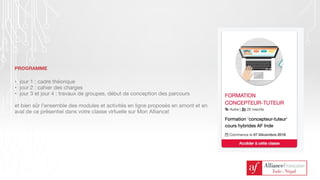 Le document traite d'un programme de formation certifiante pour les tuteurs d'apprentissage en ligne à l'Alliance Française de Bombay, axé sur les principes de la formation ouverte et à distance. Il comprend des éléments théoriques et pratiques pour concevoir des parcours d'apprentissage personnalisés, intégrant divers formats tels que l'e-learning et la formation hybride. Les formateurs restent disponibles pour accompagner les participants dans la réalisation de leurs parcours après la session en présentiel.