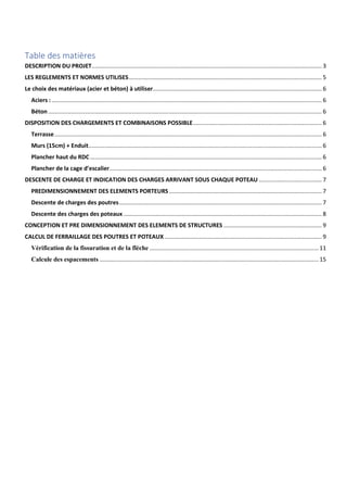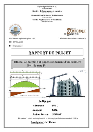 Ce document présente un rapport de projet pour la conception et le dimensionnement d'un bâtiment de type F4 à Dakar, réalisé par des étudiants en génie civil. Il décrit les réglementations, normes, matériaux utilisés, ainsi que les calculs de charges et le ferraillage des éléments porteurs. Le projet vise à répondre aux besoins en logements sociaux dans la région.