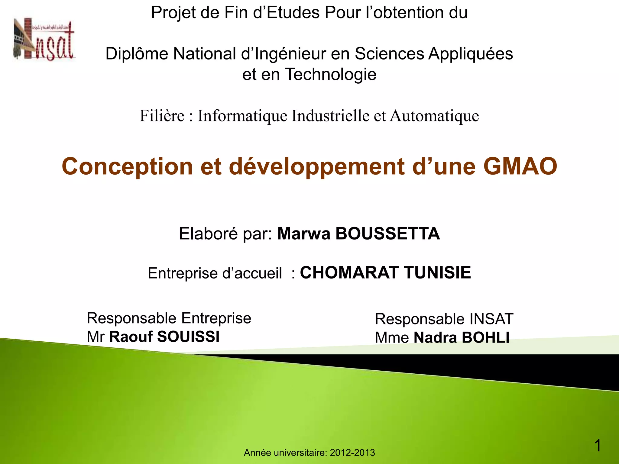 Ce document présente un projet de fin d'études sur la conception et le développement d'un logiciel de gestion de maintenance assistée par ordinateur (GMAO) pour l'atelier de finissage de l'entreprise Chomarat en Tunisie. Il aborde l'étude des besoins, la préparation à la mise en place, ainsi que les processus de maintenance existants tout en détaillant la méthodologie utilisée pour la création de l'application. La GMAO vise à optimiser le service maintenance en améliorant la gestion des pièces de rechange et en facilitant la planification et le suivi des activités de maintenance.
