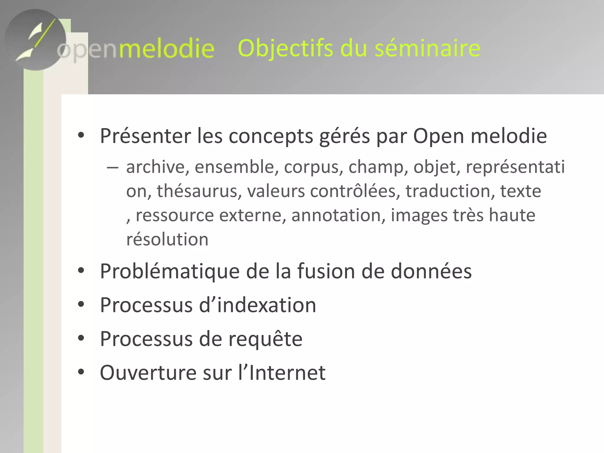 Le séminaire aborde les concepts de gestion d'objets et d'images électroniques à travers Open Melodie Archive, en mettant l'accent sur la création, l'indexation et la publication de données. Il traite également des problématiques de fusion de données, du travail collaboratif et des aspects de sécurité, ainsi que des types de champs et de l'importance des thésaurus. Enfin, il présente l'évolution des projets Open Melodie et leurs implications pour les méthodologies de recherche en sciences humaines et sociales.